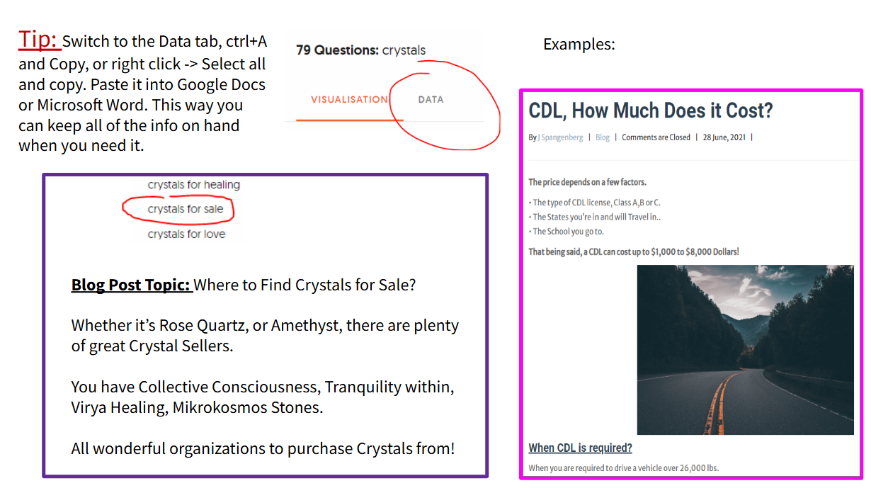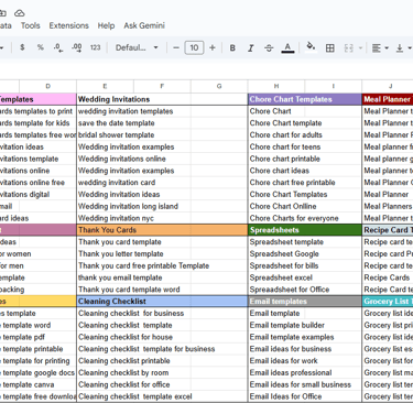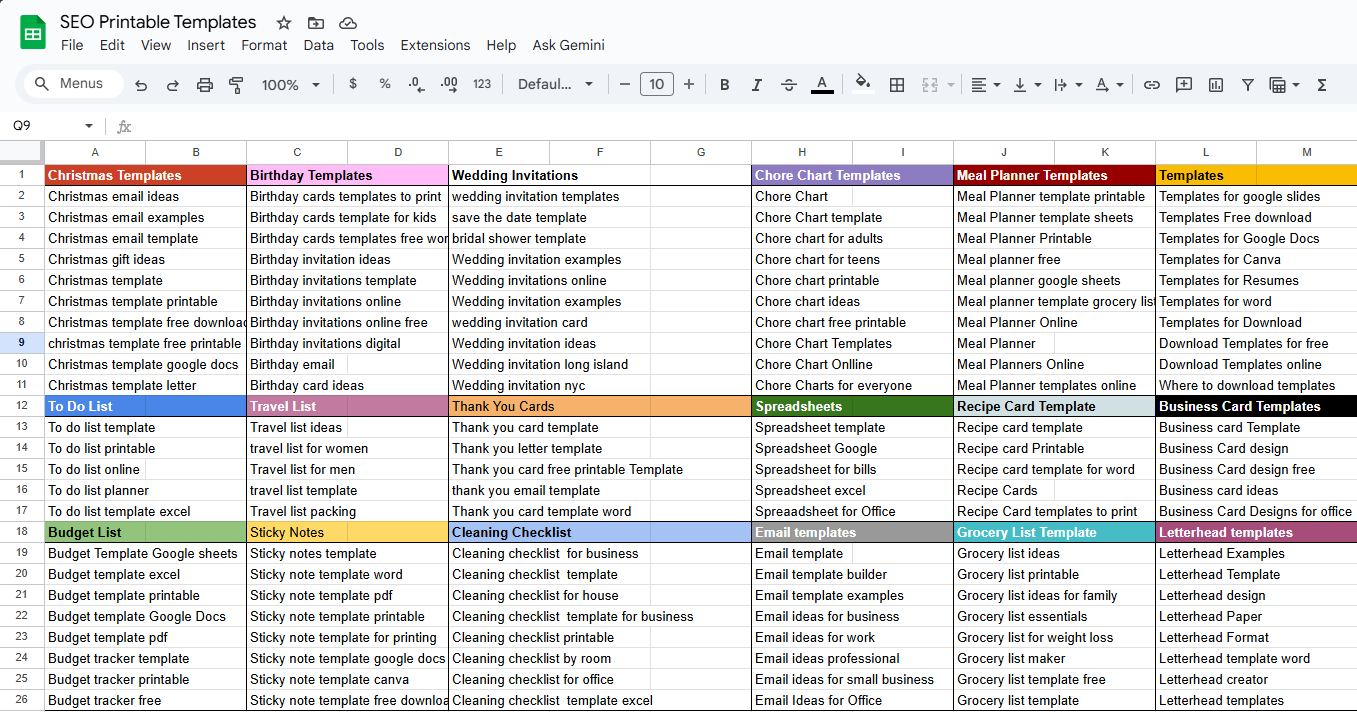 In the image above I typed in Necklace on Bing, the sentences below it are the most popular search terms for that word. Use the words in your industry to find out what sentences people in your industry are using, then write them down into a document. I prefer to use Google Sheets for SEO, as shown in the image below, which I used to find SEO for Printable Templates.